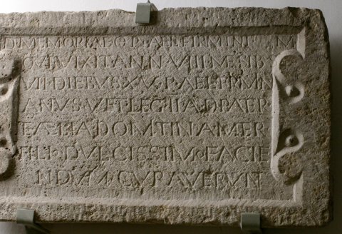 - D(is) M(anibus) // Memoriae q(uondam) P(ubli) Ael(i) Firmini / qui vixit ann(os) VIII me<n>sibus / VII diebus XV P(ublius) Ael(ius) Firmini/anus vet(eranus) leg(ionis) II ad(iutricis) pater / et Aelia Domitina mater / filio dulcissimo facie/ndum curaverunt