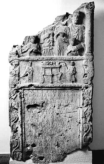 Im Hauptbild Familie : Zwischen Säulen Halbfiguren von vier Erwachsenen und drei Kindern. Von links: Frau (?), Mann: Ärmeltunica, Gürtel mit Ringschnalle, Sagum mit Fransen, in der LInken Rolle (volumen). Frau: Ärmeltunica, Korb mit Früchten. Mann: bärtig, Locken, Sagum mit Fransen, Fibel. Vorn zwei Knaben: Ärmeltunica, in den Händen Frucht.