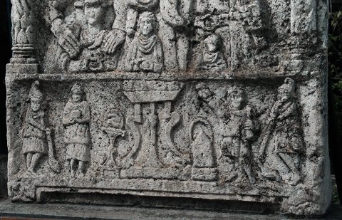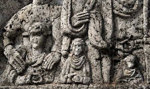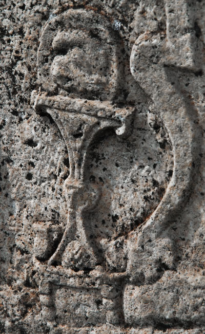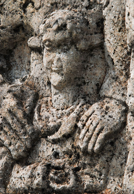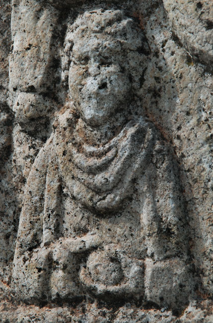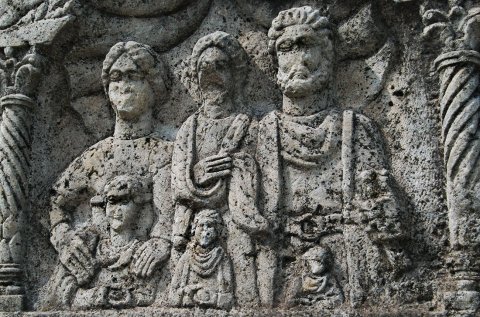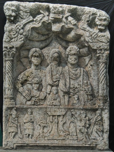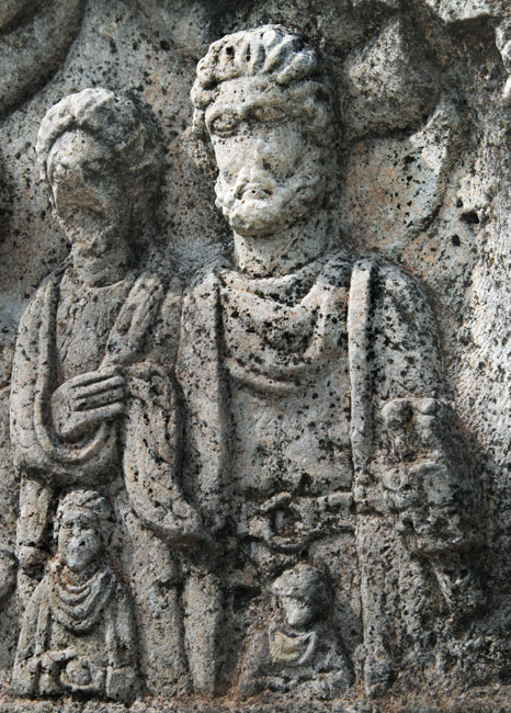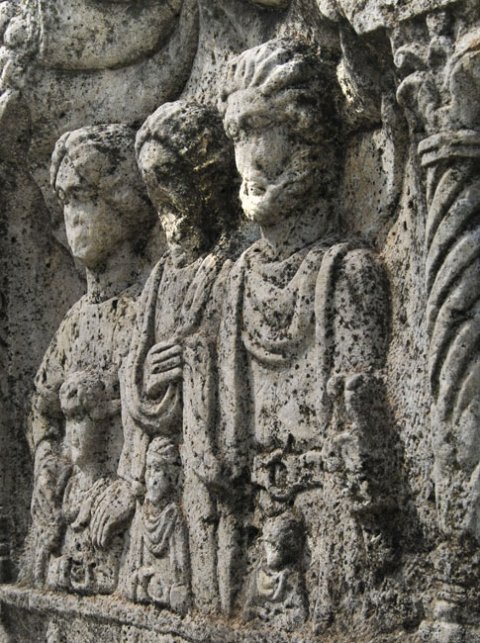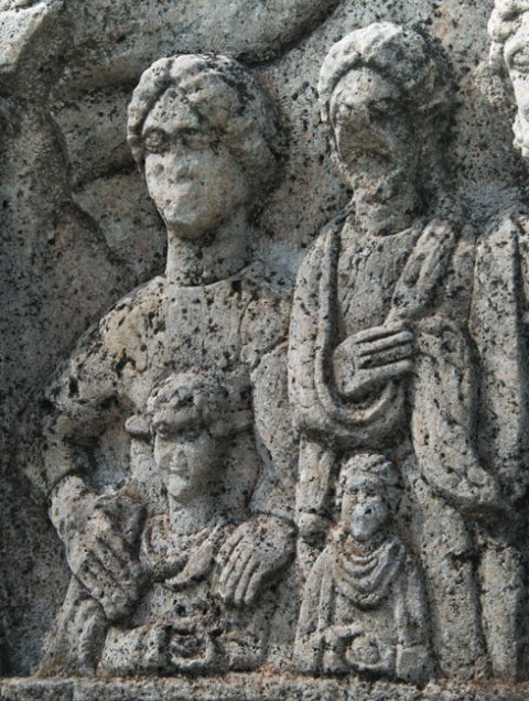 Im Hauptbild Familie: Muschelkonche auf Säulen mit Spiralkannelluren. Unter der Muschel Halbfiguren von drei Erwachsenen und drei Kindern. Links Frau: Melonenfrisur, Ärmeltunica mit Gürtel. In der Mitte Frau: Melonenfrisur, Tunica, Mantel. Rechts Mann (Soldat): bärtig, Locken, Sagum, Gürtel mit Ringschnalle, Schwert (?) in der Linken. Vorn drei Knaben: Locken, Sagum, Scheibenfibel, in den Händen Apfel.