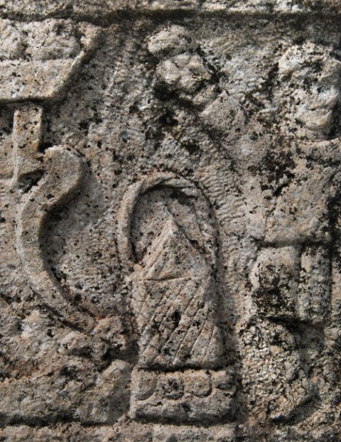 Als Bekrönung liegende Löwen mit Widderköpfen in den Pranken. Zwischen ihnen bärtiger Kopf (?).