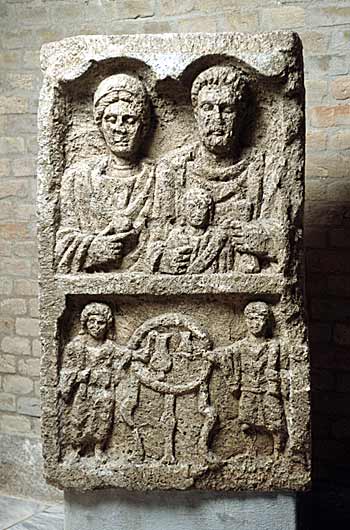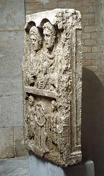 Im Hauptbild Familie: unter Doppelbogen Brustbilder eines Ehepaares mit Kind. Links Frau: Mittelscheitel, Haarnetz, Tunica, Mantel, Halsband, in der Rechten Apfel. Rechts Mann: bärtig, kurze Locken, Ärmeltunica, Sagum, Fibel, in der Linken Rolle (volumen). Vorn Mädchen: gewelltes Haar, Tunica, Mantel.