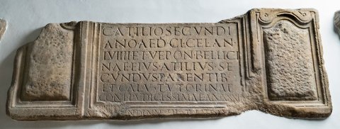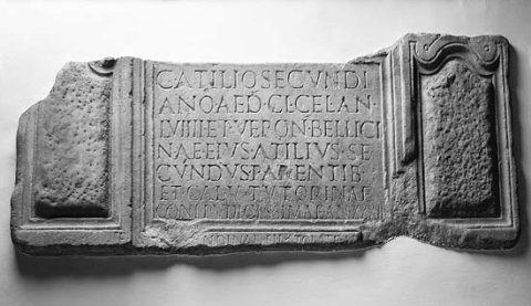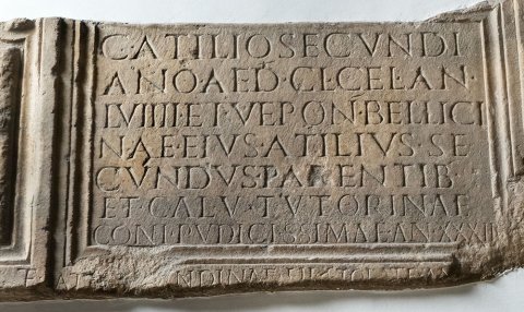 - C(aio) Atilio Secundi/ano aed(ili) Cl(audia) Cel(eia) an(norum) / LVIIII et Vepon(iae) Bellici/nae eius Atilius Se/cundus parentib(us) / et Calv(isiae?) Tutorinae / coni(ugi) pudicissimae an(norum) XXXII // et At[il(iae) Secu]ndinae fil(iae) stolat(a)e an(norum) [---]