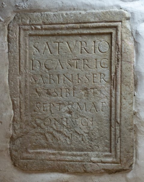 - Saturio / D(ecimi) Castric(ii) / Sabini ser(vus) / v(ivus) f(ecit) sibi et / Septumae / coniugi / ann(orum) LX
