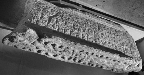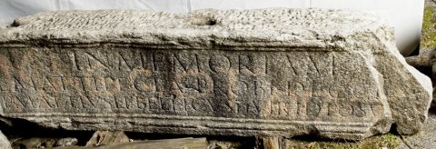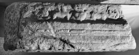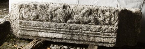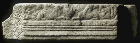 - Zwei Architravbalken vom selben Grabbau (Vorder- und Rückseite). Außenseite: gerahmte Inschrift. Innenseite: mythische Figur (Gefäß zwischen Greifen). Unterseite: Lorbeerkranz mit Taenien.