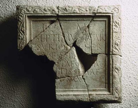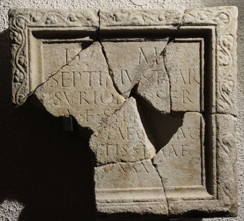 - D(is) M(anibus) / Septimus T(iti) Var(ii) / Syrionis ser(vus) / v(ivus) f(ecit) sibi et / [Qui]ntae coniug(i) / [pie]ntissimae / [an]n(orum) XXXV