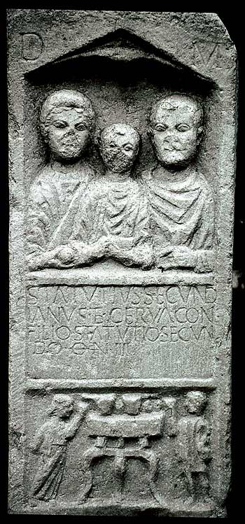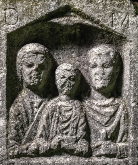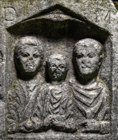 Im Hauptbild Familie: unter offenem Giebel Muschelnische, darin Brustbilder von Ehepaar mit Kind. Links Frau mit Haarnetz, Tunica und Mantel, Halskette, in der Rechten Apfel. In der Mitte Knabe in Ärmeltunica und Sagum, in den Händen Vogel. Rechts bärtiger Mann in Ärmeltunica und Sagum, in der Linken Rolle (volumen).