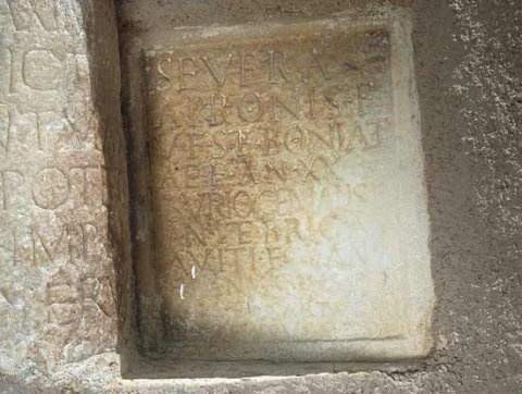 - Severa / Apronis f(ilia) / v(iva) f(ecit) s(ibi) et Boniat/ae f(iliae) an(norum) XX / Surio Genialis f(ilius) / an(norum) L et Briga / Aviti f(ilia) an(norum) XL / et Ianuarius Gen/ialis et Saturia / con(iux) Severus Surio an(norum) LX