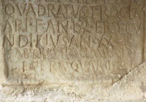 - Trogimarus / Maeni f(ilius) an(norum) LX / Quadratus Trogim/ari f(ilius) an(norum) LXX et Secu/ndinus an(norum) XX / Sabianus Trogimara C(ai) / Severa Quarti [ --- ] / Firmus [ --- ]