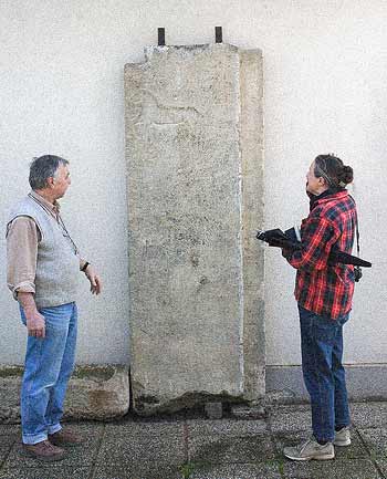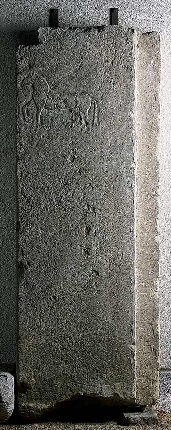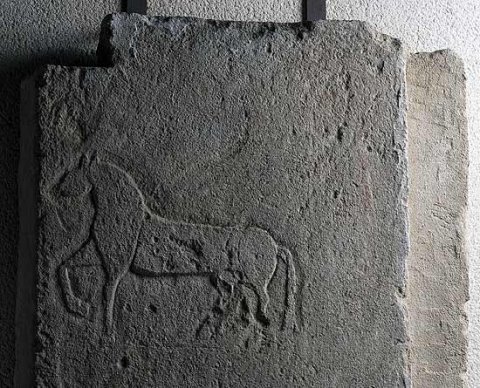 - Ungerahmte Platte mit Falz rechts und rechteckiger Ausnehmung links oben (Balkenauflager). Im oberen Teil Pferd.
