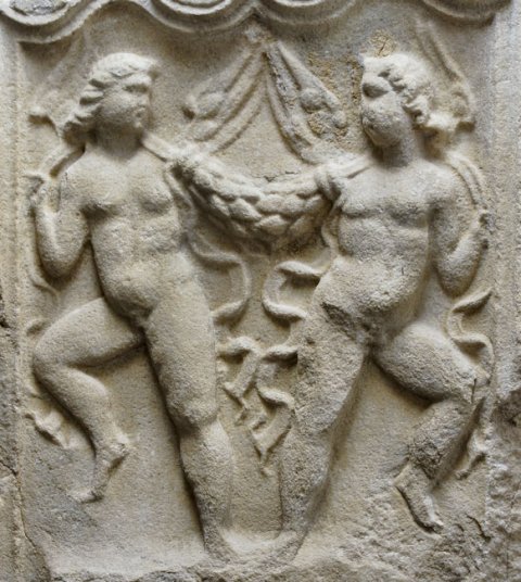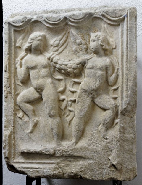 - Nische mit oben geschwungenem Rahmen. Auf flachem Podest halten zwi nackte geflügelte Knaben (Genius) eine Girlande mit Bändern.