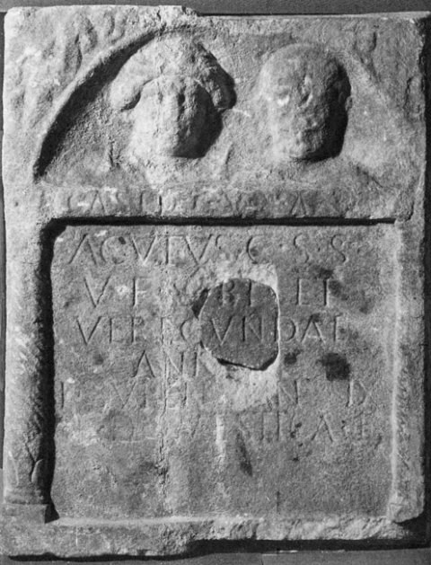 - Acutus C() S() s(ervus) / v(ivus) f(ecit) sibi et / Verecundae / ann(orum) [---] / f(ilio) Super(o) an(norum) IX / et Domestica f(ilia)