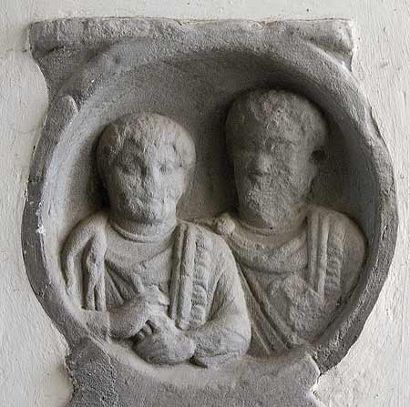 - In glattem Rahmen zwei Brustbilder. Links Knabe: Ärmeltunica, Sagum mit Fransen, Halstuch, in den Händen Schreibzeug (?). Rechts Mann (Soldat): bärtig, Sagum mit Fransen, Scheibenfibel. Waffen: unter dem linken Arm Schwert mit Adlerkopfgriff. Über dem Medaillon Giebelschräge.