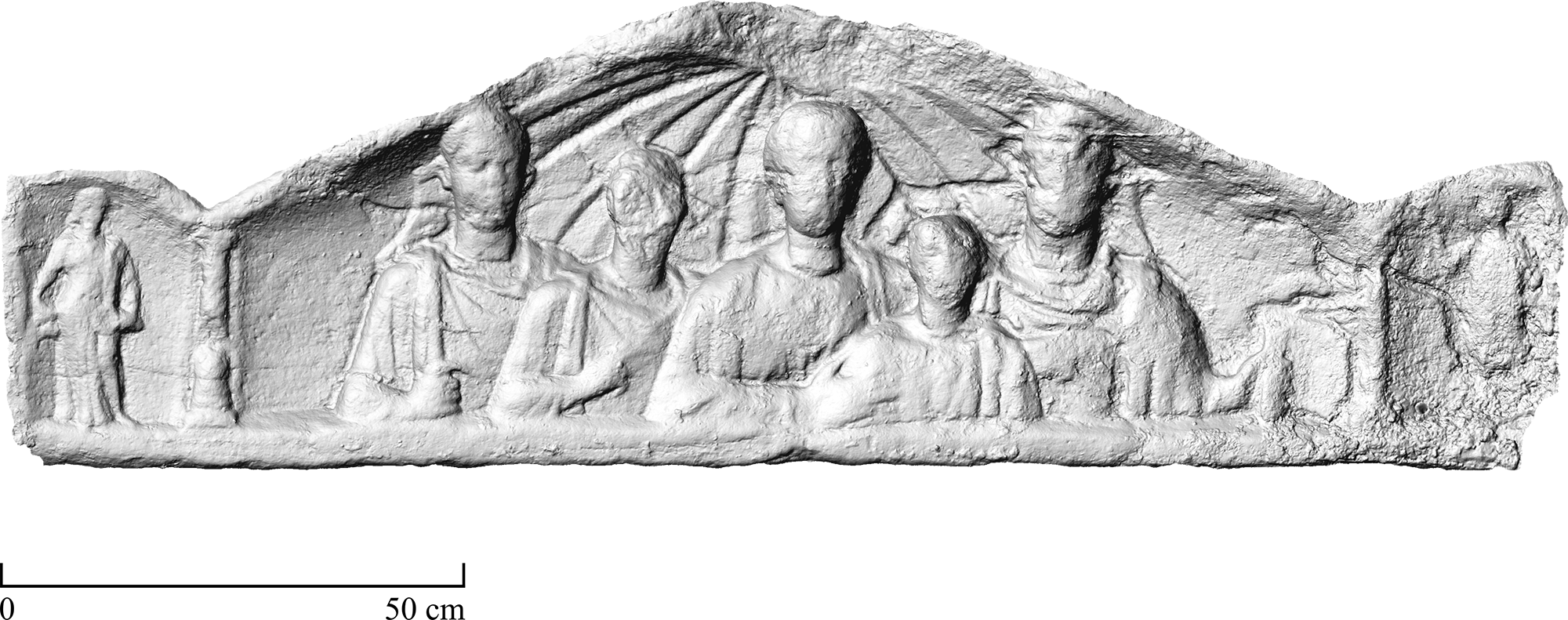 4143 Aschenkistendeckel mit Grabrelief einer Familie