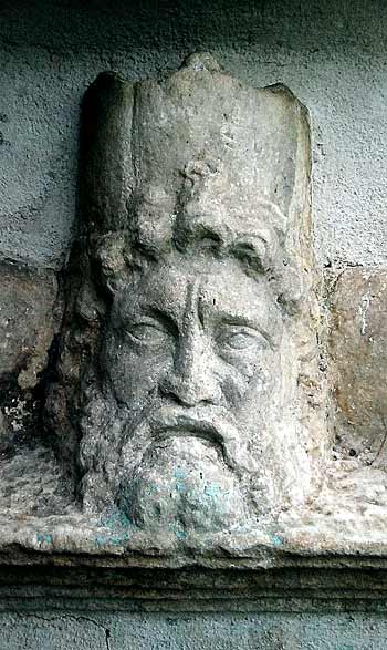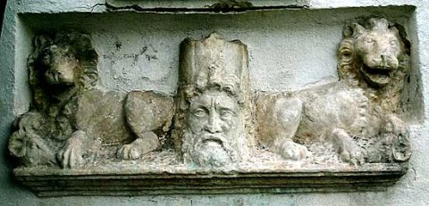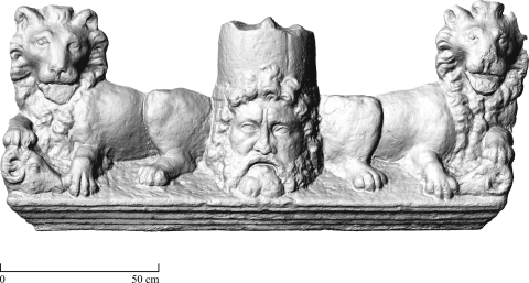 - Auf profiliertem Gesims liegende Löwen mit Widderköpfen in den Pranken, zwischen ihnen bärtiger Kopf mit Polos.