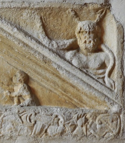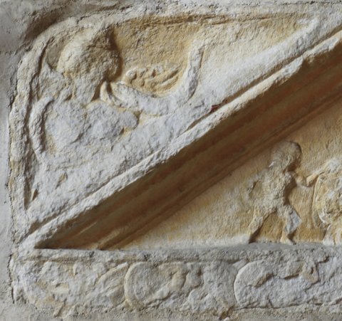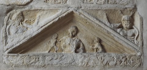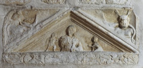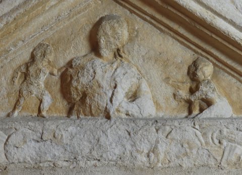 - Halbfigur einer Frau in gegürtetem Ärmelgewand, rechts kauerndes und links laufendes nacktes Kleinkind. Über den Giebelschrägen mythische Figuren: rechts Oberkörper einer bärtigen Gottheit mit Geweih (?), links völlig abgeschlagene weibliche geflügelte Figur. Auf der unteren Rahmenleiste Waffenfries.