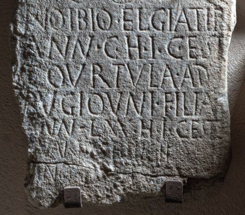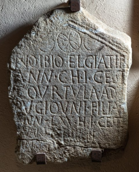 - Noibio Elgiati f(ilius) / ann(orum) C hic est / Courtula Ad/bugiouni filia / an(norum) LXX hic est / [---]unius [---]gi f(ilius) Nov[---]tui sui[---