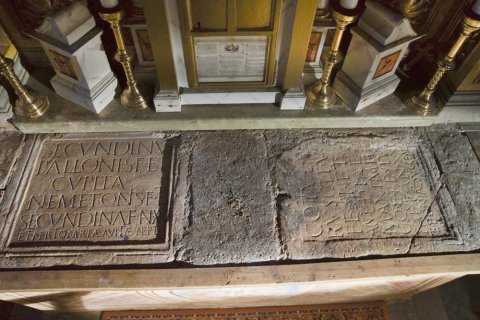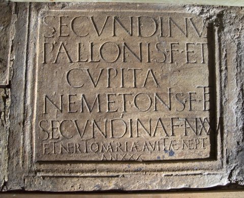 - Secundinus / Pallonis f(iliuis) et / Cupita / Nemetonis f(ilia) et / Secundina f(ilia) an(norum) XXV / et Nertomariae Avitae nept(i) / an(norum) XXX