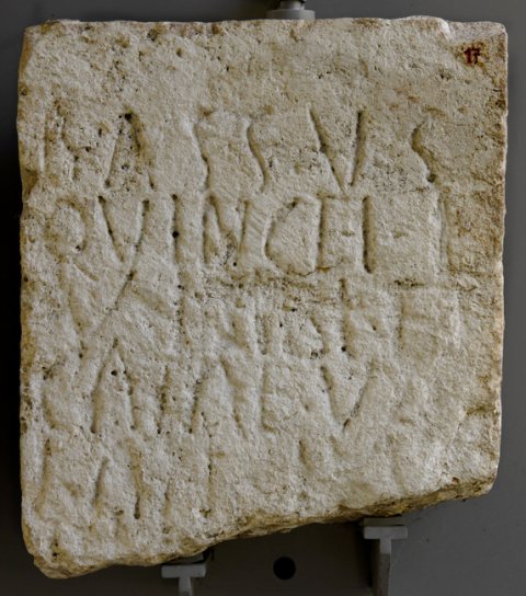- Bassus / Quincti l(ibertus) / v(ivus) f(ecit) sibi et / Catae ux(ori) / an(norum) LXV / [---