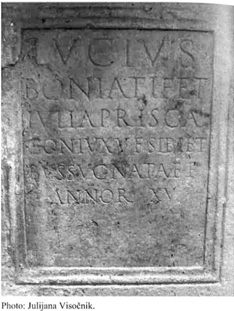 - Lucius / Boniati f(ilius) et / Iulia Prisca / coniu(n)x v(ivi) f(ecerunt) sibi et / Bussugnatae f(iliae) / annor(um) XV