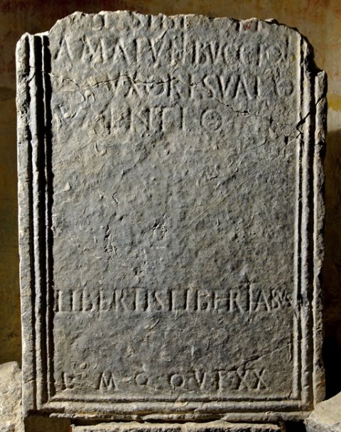 - ---] / v(ivus) f(ecit) sibi et / Amatuni Buccioni/[s f(iliae)] uxori suae o(bitae) / Valenti o(bito) / libertis libertabus / l(ocus) m(onumenti) q(uo)q(uo) v(ersus) p(edes) XX