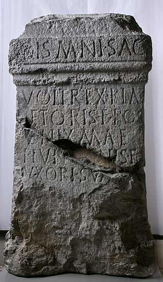 - Dis Mani(bus) sac(rum) / Voltrex Pla/etoris f(ilius) po(suit) / Venixamae / Plunconis f(iliae) o(bitae) / uxori suae et si(bi)