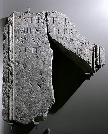 - ---] / Pudenti Brix(ia) / mil(iti) coh(ortis) II pr(aetoriae) |(centuria) / Grani mil(itavit) an(nos) VII / vixit an(nos) XXV t(estamento) f(ieri) i(ussit)
