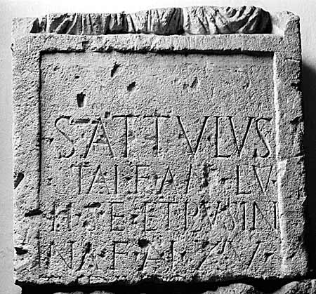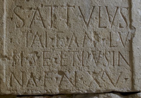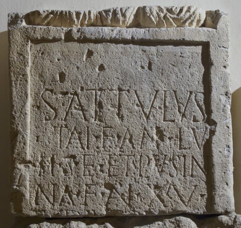 Sattulus, der Sohn des Taius, mit 55 Jahren verstorben, liegt hier begraben und Pusinna, die Tochter, mit 15 Jahren verstorben.