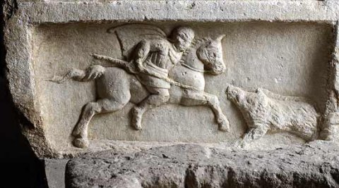 Im Sockelbild Jagdszene: Reiter mit Sagum, Helm (?) und Lanze gegen Eber. - Inschrift