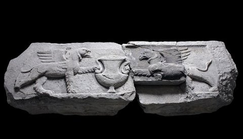 Auf der Vorderseite mythische Figuren : Krater zwischen stehenden Greifen.