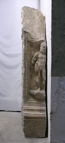 - Mythische Figur : Bildfeld mit geschwungenem oberen Rahmen, links auf flachem Podest bärtiger nackter Herakles (Hercules), rechter Arm auf den Rücken gelegt.