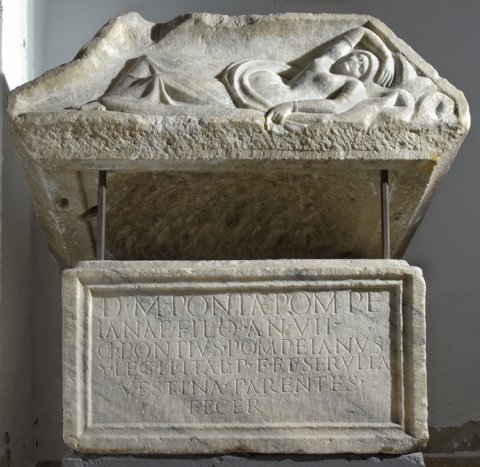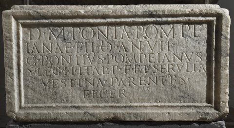 - D(is) M(anibus) Pontiae Pompe/ianae fil(iae) o(bitae) an(norum) VII / C(aius) Pontius Pompeianus / (centurio) leg(ionis) II Ital(icae) p(iae) f(idelis) et Servilia / Vestina parentes / fecer(unt)