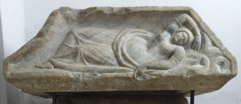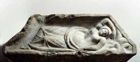 - Auf dem Deckel Mythos: auf der vertieften Dachfläche schlafende Ariadne mit entblößtem Körper, Mantel um die Beine, an den Oberarmen Ringe. Unter dem Kopf angedeuteter Felsgrund.