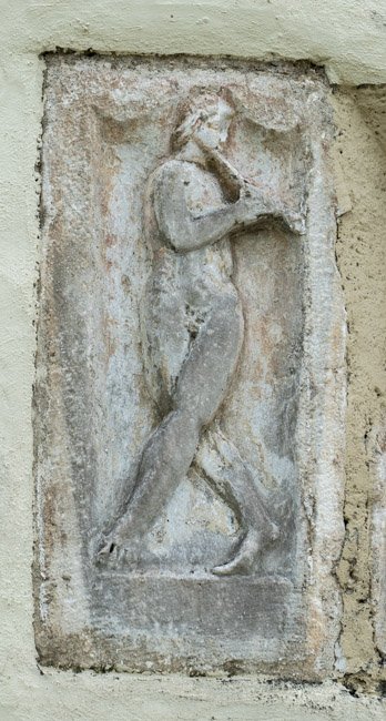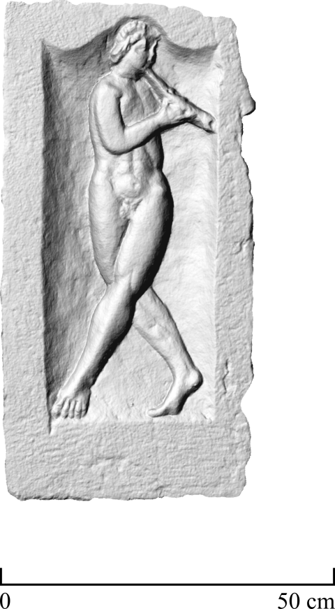 Mythische Figur, Musikinstrument: nackter tanzender Satyr mit Flöte. Rahmen oben bogenförmig mit geschwungenen Enden. - Kommentar