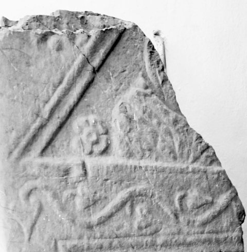 - Eingeschriebener Giebel, darin Blattornament zwischen Rosetten. Zwischenfries mit Ranke.