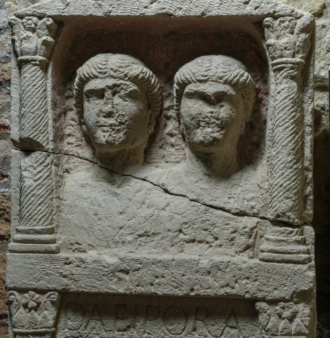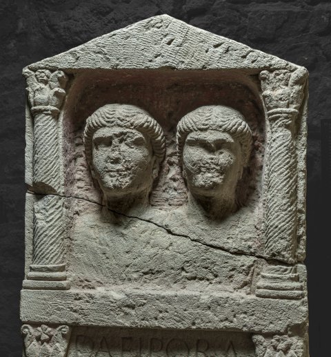 Im Hauptbild zwischen Säulen mit Spiralkanneluren Büsten von zwei Frauen mit julisch-claudische Frisur.