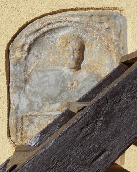 - In Bogennische Brustbild einer Frau. In den Zwickeln über dem Bogen Delphine.