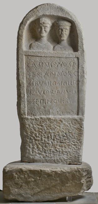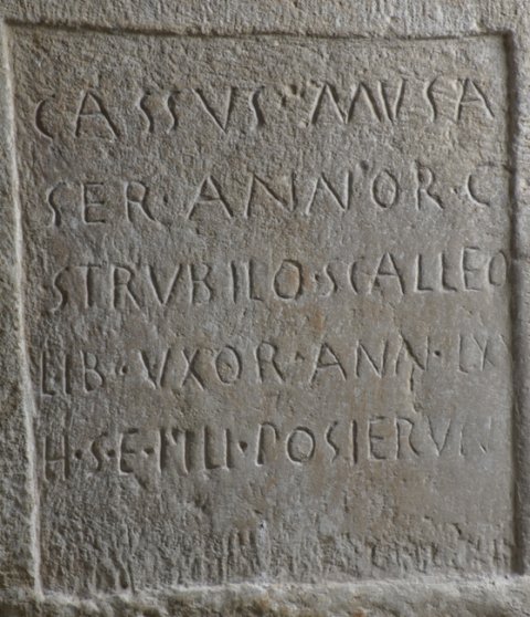 - Cassus Musa(e) / ser(vus) annor(um) C / Strubilo Scalleo(nis) / lib(erta) uxor ann(orum) LX / h(ic) s(ita) e(st) fili(i) pos<u=I>erunt