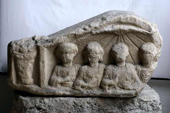4255 Aschenkistendeckel mit Grabrelief einer Familie