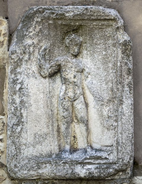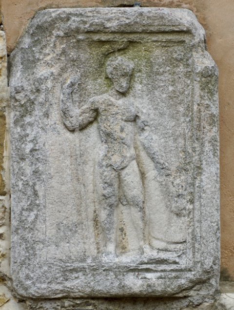 - Mythische Figur (Mars, Heros ?). In Rechteckfeld stehender nackter Mann mit Waffen: Helm, in der Rechten Lanze, die Linke auf dem Schild.
