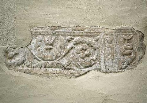 - Mythische Figur : Mittelfeld mit Akanthuskelch mit zwei Volutenranken, rechts zwei schmale Felder mit Satyr bzw. Delphin.