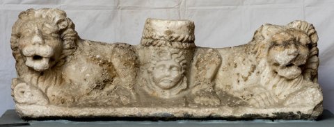 - Liegende Löwen mit Widderköpfen in den Pranken, zwischen ihnen geflochtene Ciste und Gorgoneion.