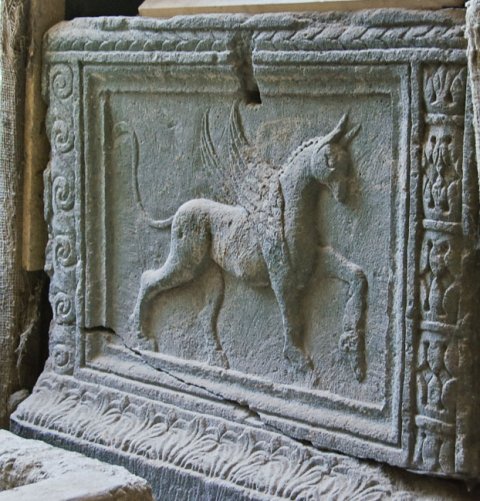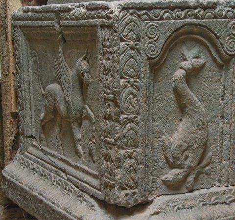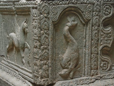 Auf den Schmalseite je ein stehender geflügelter Greif. Unten umlaufendes Profil mit Blattkyma. Vertikale Rahmen mit verschiedenem Blattdekor. - Inschrift