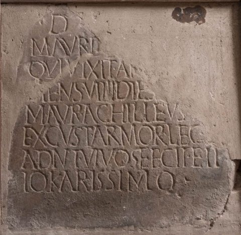 - --- ] / D(is) [M(anibus)] / M(arcus) Aur(elius) Di[omedes(?)] / qui vixit an[nos --- ] / mens(es) VIIII dies [ --- ] / M(arcus) Aur(elius) Achilleus [vet(eranus)] / ex cust(ode) armor(um) leg(ionis) I[I] / Adiut(ricis) vivos(!) eecit(!) eil/io(!) karissimo