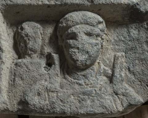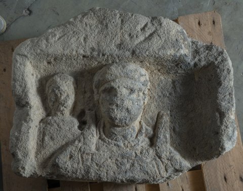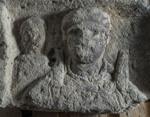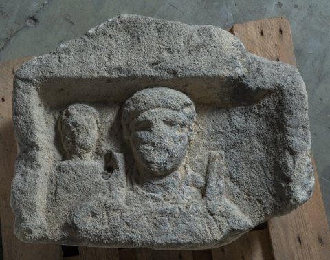 - Iin Rechtecknische Brustbild (?) einer einheimischen Frau: Haube, Fibeln, Halsring. Über der rechten Schulter Büste eines Kindes.