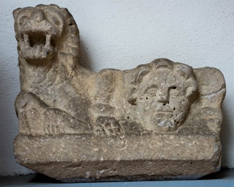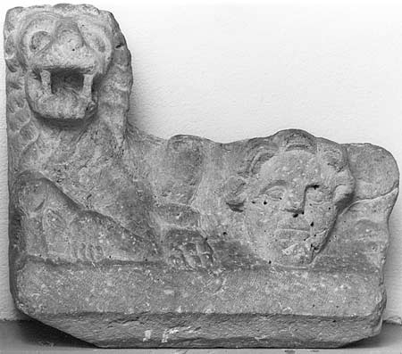 - Liegende Löwen, zwischen ihnen menschlicher Kopf mit gelocktem Haar.