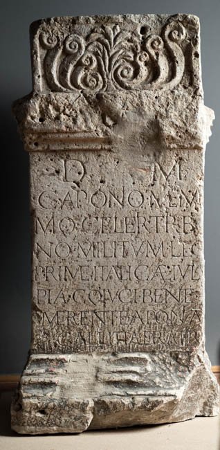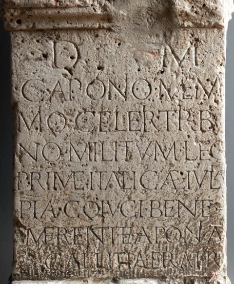 - D(is) M(anibus) / C(aio) Aponio Mem/mio Celeri tribu/no militum leg(ionis) / primae Italicae Iulia / Pia co(n)iugi bene / merenti et Apontia / Gallitia fratr(i)
