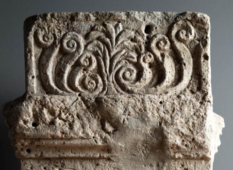 - Über dem oberen Gesims kubischer Aufsatz, vorn Blattkelch zwischen Halbpalmetten.