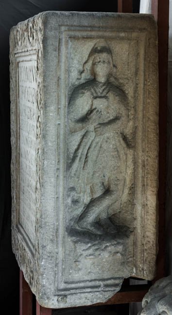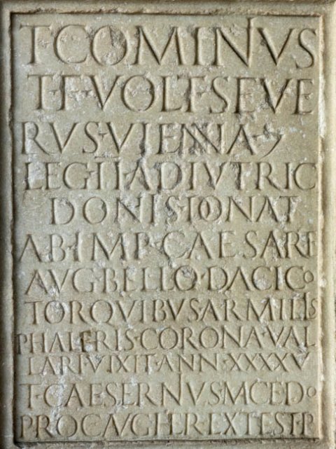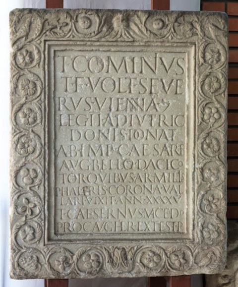 - T(itus) Cominius / T(iti) f(ilius) Volt(inia) Seve/rus Vienna (centurio) / leg(ionis) II adiutric(is) / donis donat(us) / ab imp(eratore) Caesare / Aug(usto) bello Dacico / torquibus armillis / phaleris corona val/lari vixit ann(os) XXXXV / T(itus) Caesernius Macedo / proc(urator) Aug(usti) her(es) ex test(amento) p(osuit)