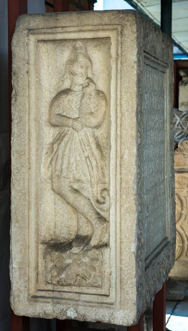 Auf den profiliert gerahmten Nebenseiten mythische Figur, Musikinstrument: rechts Attis mit Pedum, links mit Syrinx, beide auf Podest.