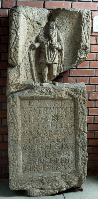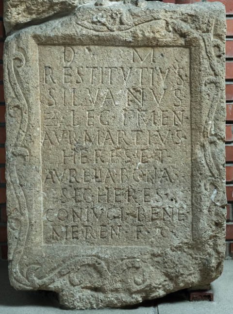 - D(is) M(anibus) / Restitutius / Silvanus / |(centurio) leg(ionis) I Men(erviae)(!) / Aur(elius) Martius / heres et / Aurelia Bona / sec(undus) heres / coniugi bene / meren(ti) f(aciendum) c(uraverunt)